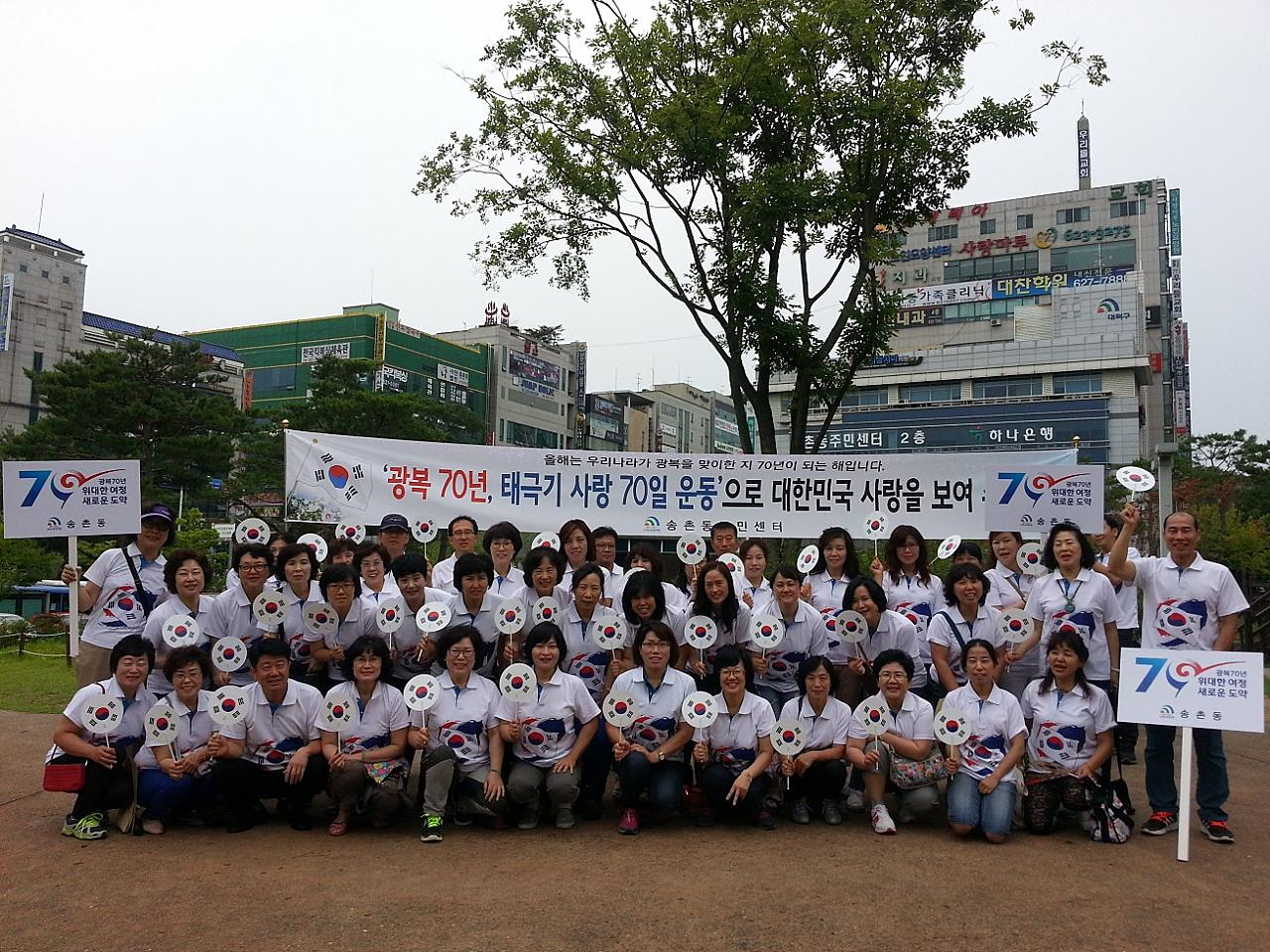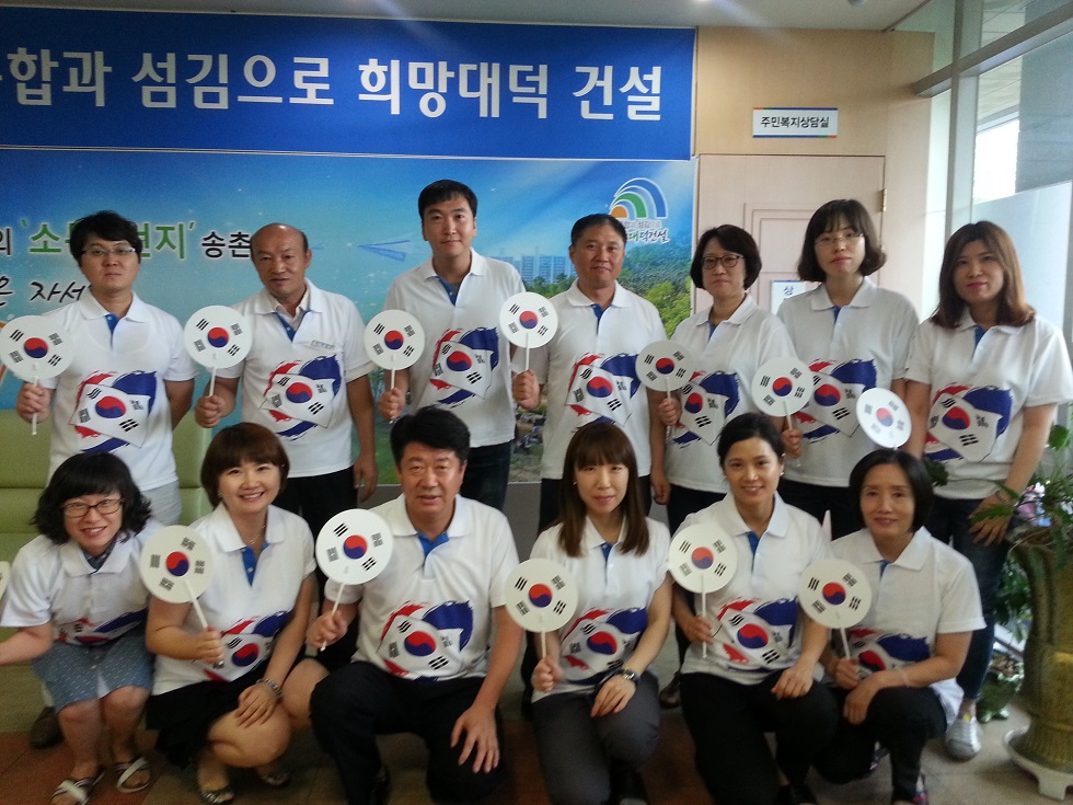 송촌동과 송촌동 주민자치위원회(위원장 정구평)는 7월초부터 8월14일까지 광복70주년을 기념하며 태극기 사랑을 홍보하기 위하여 주민센터 민원창구위에 수십여개의 미니 태극기를 게양하고 태극기 부채를 제작하였으며 전 직원이 태극 티셔츠를 입고 근무하고 있다.