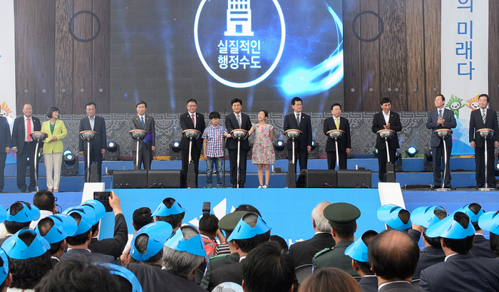 (사진 왼쪽부터 임상전 세종시의회의장, 김인식 대전시의회 의장, 이해찬 국회의원, 제정부 법제처장, 정재근 행정자치부 차관, 이춘희 세종시장, 이시종 충북지사, 권선택 대전시장, 안희정 충남지사, 송하진 전북지사, 이낙연 전남지사)