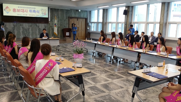 대전시 중구(구청장 박용갑)는 20일 청내 대회의실에서 2015년 미스 인터콘티넨탈 충청권대회 예심 통과자들을 ‘제7회 대전효문화뿌리축제’ 홍보대사로 위촉했다.