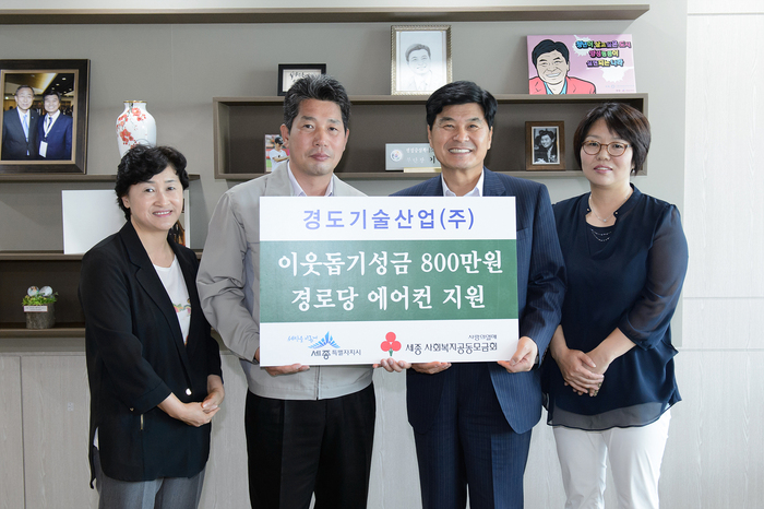 경도기술산업은 6일 오후 세종시청을 방문해 무더위 쉼터로 지정된 경로당 16개소(연기면 1, 부강면 1, 연서면 12, 전의면 2)에 8백만 원 상당의 에어컨을 사회복지 공동모금회에 지정 기탁했다.