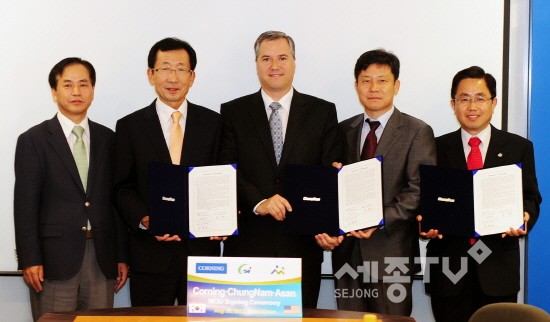 이날 서울 코닝사 사무실에서 열린 협약식에는 권희태 충남부지사와 앤드류 필슨(Andrew M. Filson) 코닝 부사장, 송윤구 SCG사장, 강병국 아산시 부시장 등이 참석했다.