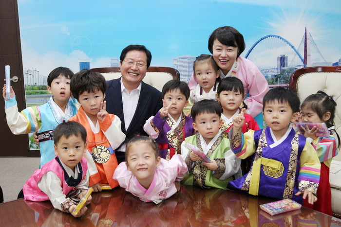 [대전=세종tv] 장종태 서구청장이 지난 23일 구청 직장어린이집 아이들과 함께 ‘풍성한 한가위’ 인사를 나눴다.