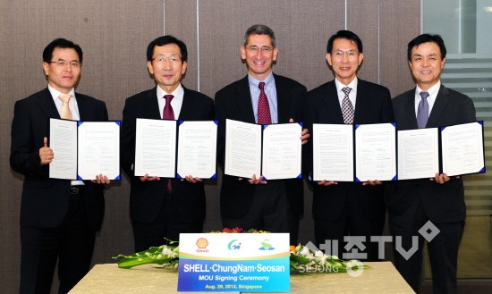 도는 29일 싱가포르 Shell사에서 권희태 충남부지사와 마크 게인스보로우(Mark Gainsborough) Shell 대표, 이완섭 서산시장, 문종박 현대오일뱅크 전무, 강달호 현대쉘베이스오일 사장 등이 참석한 가운데 투자협약을 맺었다.