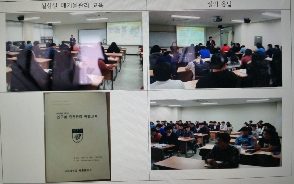 고려대측은 “교육 주요내용은 실험실에서 발생할 수 있는 지정폐기물 종류와 배출방법, 무분별한 배출때 책임과 과태료, 실험실 폐기물 처리지침서 배부와 질의응답 시간으로 편성했다”고 설명했다.