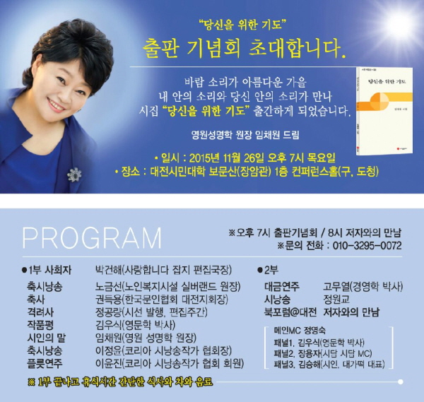이번 저자와의 만남 행사에는 ’당신을 위한 기도’ 시집을 출간한 임채원 영원성명학 원장을 초대해 시민들과 책이야기와 함께 문학에 예술에 대한 질의 응답이 오갈 예정이다.또 친필사인과 기념사진 촬영이 진행된다. 저자와 함께 다과와 티파티도 열린다.