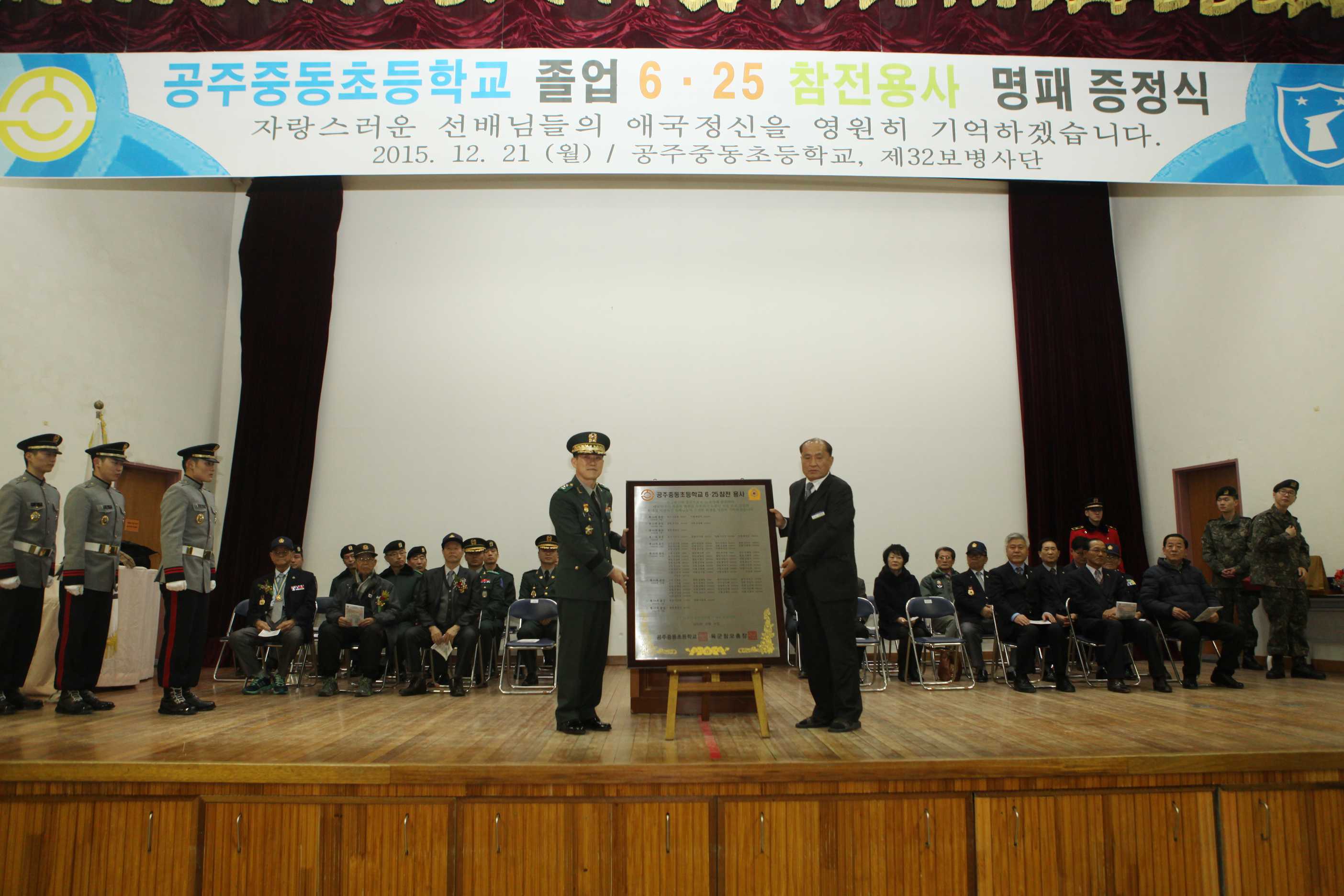 32사단장(소장 정형희)과 공주중동초등학교장(전왕희) 주관하에 열린 이날 행사에는 명규식 공주시 부시장, 박병수 시의회 부의장, 박수현 국회의원, 이명현 대전지방보훈청장과 학교 교직원, 학생 등 300여명이 참석하였다.