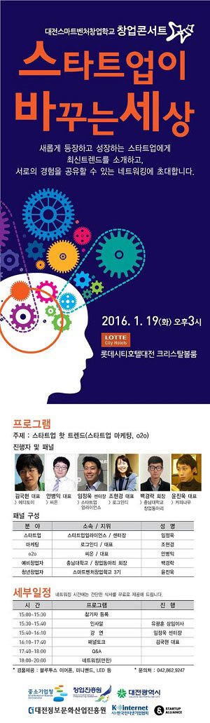 창업에 관심이 있는 젊은이라면 누구나 창업콘서트에 참여가 가능하며 문의는 대전스마트벤처창업학교(042-862-9247)로 하면 된다.