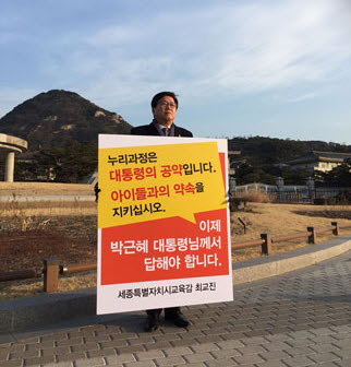 최교진 세종시교육감이 지난 11일 오전 8시 30분부터 9시 30분까지 청와대 분수대 앞에서 ‘누리과정 공약 이행 촉구’를 위한 1인 시위를 했다.