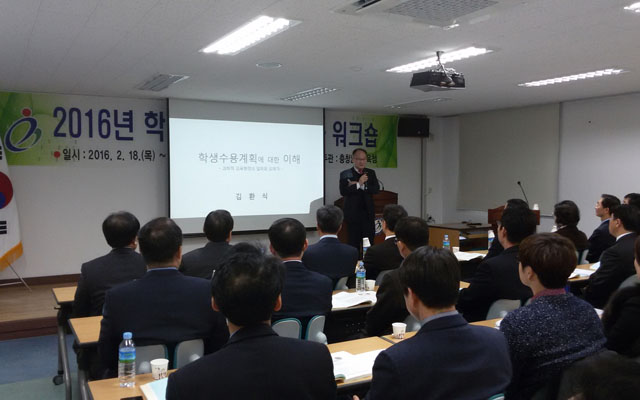 충남도교육청(교육감 김지철)은 18일부터 19일까지 양일간에 걸쳐 충남학생임해수련원에서 학생수용 업무담당자의 업무능력 향상을 위해 도내 교육지원청 행정과장 및 학생수용업무담당자 등 56명을 대상으로 ‘2016년 학생수용 업무담당자 전문성 강화 연수’를 실시했다.