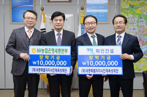 파인건설과 NH농협은행이 23일 오후 세종시를 방문하여 장학기금 1천만원을 각각 (재)세종시인재육성재단에 지정 기탁했다.