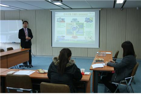 대전제대군인지원센터가 개최한 취업워크숍에서 송섭영 교육팀장이  중기복무 제대군인에게 전직지원제도에 대해 설명하고 있다.