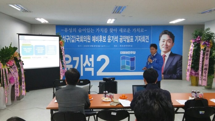 더불어민주당 윤기석 국회의원 유성(갑)예비후보는 7일 11시에 유성 봉명동 자신의 선거캠프에서 2차 공약발표 기자간담회를 가졌다.