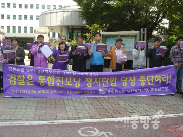통합진보당 대전시당과 충남도당은 20일 오전 11시 서구 둔산동 소재 대전지방검찰청 앞에서 가진 기자회견을 통해“정치검찰의 정치탄압과 공안탄압을 당장 중단하라"고 주장했다.