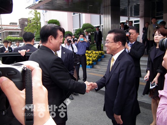 [세종방송=이용민 기자] 26일 오후 2시 30분 강창희 국회의장이 세종시청을 방문해 유한식 시장과 인사를 나누고 있다. 강 의장은 이날 시장실에서 환담을 나눈 후 세종시 현황에 대한 보고를 받았다. 또 밀마루전망대에서 정부청사 건설현황을 살피고 참샘초등학교를 방문했다.