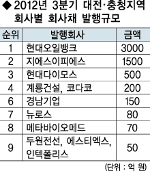 올 3분기 대전·충청지역 기업의 회사채 발행규모가 지난해 같은 기간에 비해 3배 이상 증가한 것으로 나타났다.