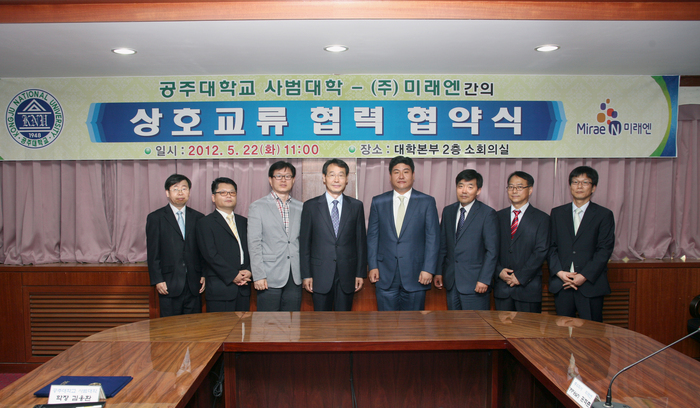공주대학교 사범대학(학장 김응환)은 22일 오전 대학본부 3층 대회의실에서 김응한 사범대학장과 김영진 ㈜미래엔 대표이사 등 양 기관 관계자가 참석한 가운데 상호 학술교류 협력 협약을 체결했다.