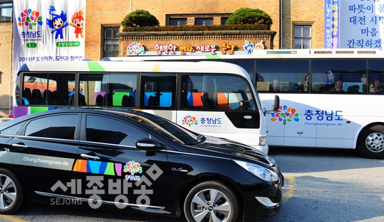 충남도청 버스가 ‘내포스타일’로 새 옷을 입은 모습. 충남도는 21일 도 본청 공용차량 21대에 뉴(new) 충남CI(City identity)를 부착하는 랩핑 작업을 모두 마쳤다고 밝혔다(승용차 11대, 버스 등 승합차 7대, 화물차 3대).