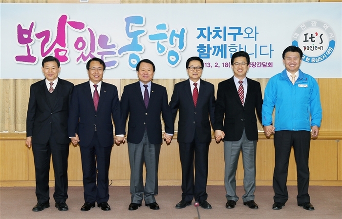 염 시장은 이날 오전 11시 시청 대회의실에서 한현택 동구청장, 박용갑 중구청장, 박환용 서구청장, 허태정 유성구청장, 정용기 대덕구청장 등 5개 구청장이 참석한 가운데 구청장과의 간담회를 가졌다.