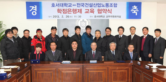 호서대학교(총장 강일구)는 26일 아산캠퍼스에서 전국건설산업노동조합과 학점은행제 교육 협약을 가졌다.