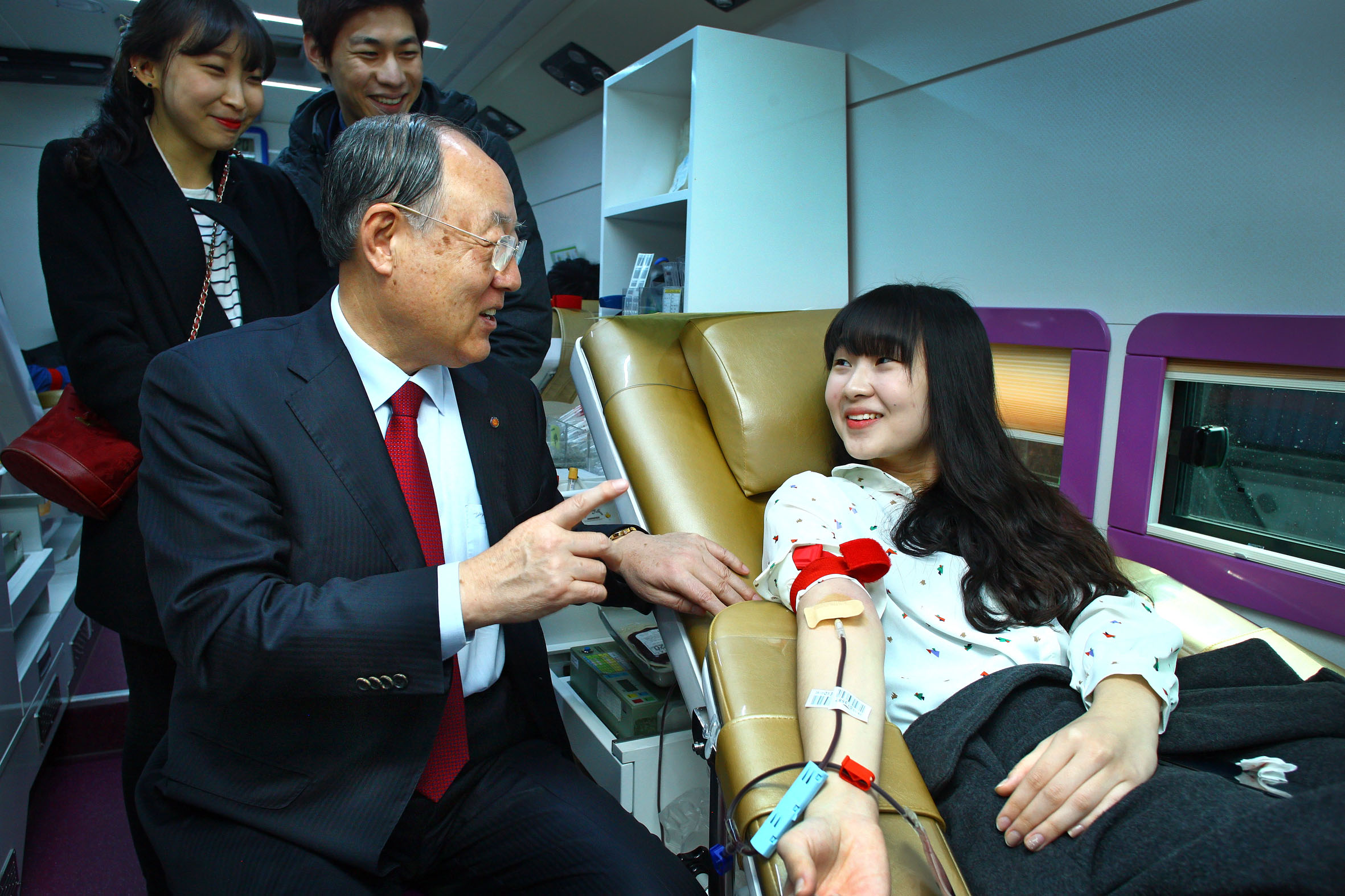 사지은 4일 오전 10시 30분 한남대 2013학년도 신입생 입학식이 열린 가운데, 교내 성지관 앞에서 ‘사랑의 헌혈’ 캠페인에 참여하고 있는 김형태 총장과 신입생.