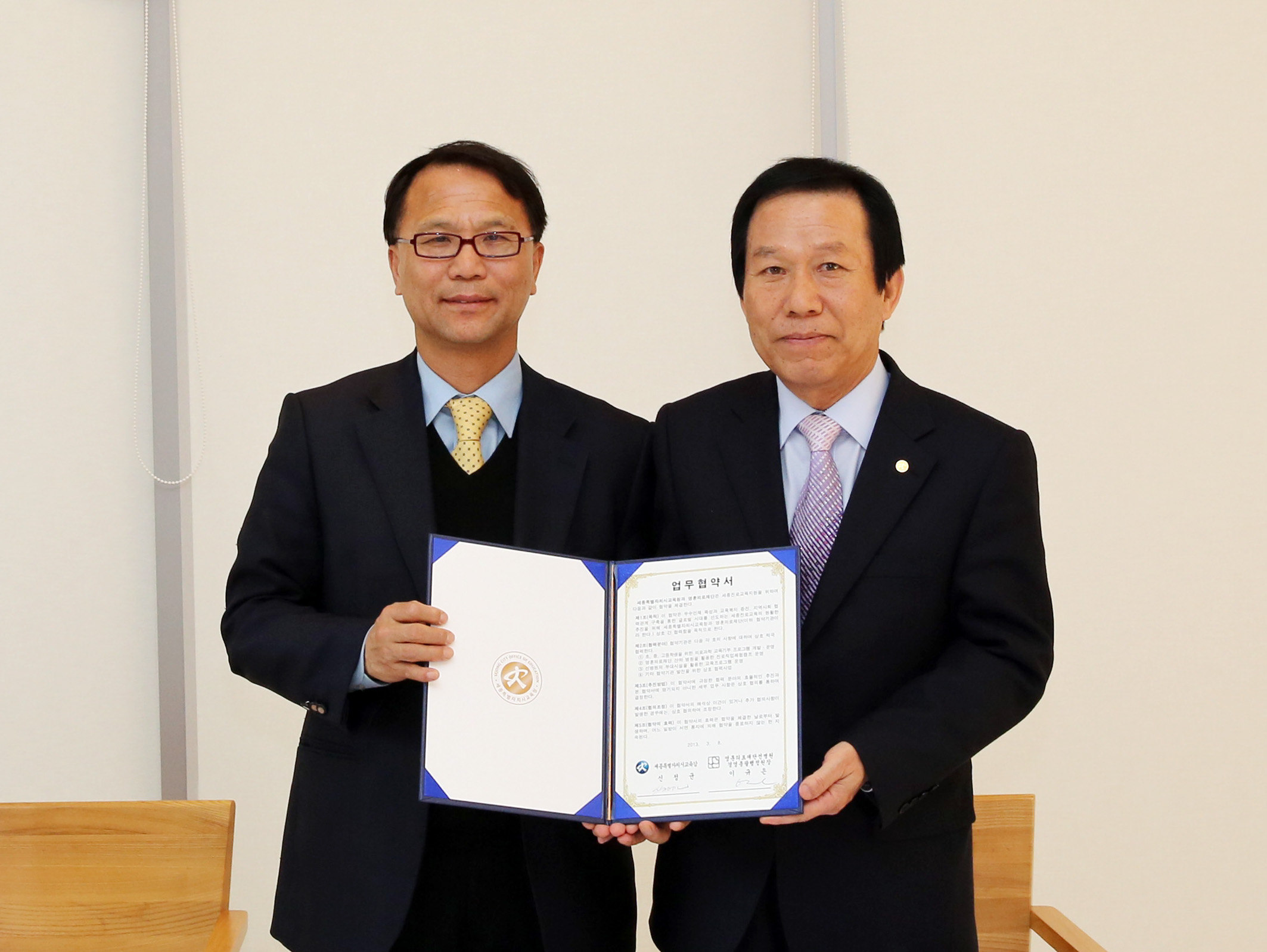세종시교육청(교육감 신정균. 사진 오른쪽)과 영훈의료재단 선병원(경영총괄행정원장 이규은)은 8일 오후 3시 유성선병원에서 세종시 초.중등 학생들의 진로직업체험지원을 위한 업무협약을 체결했다.