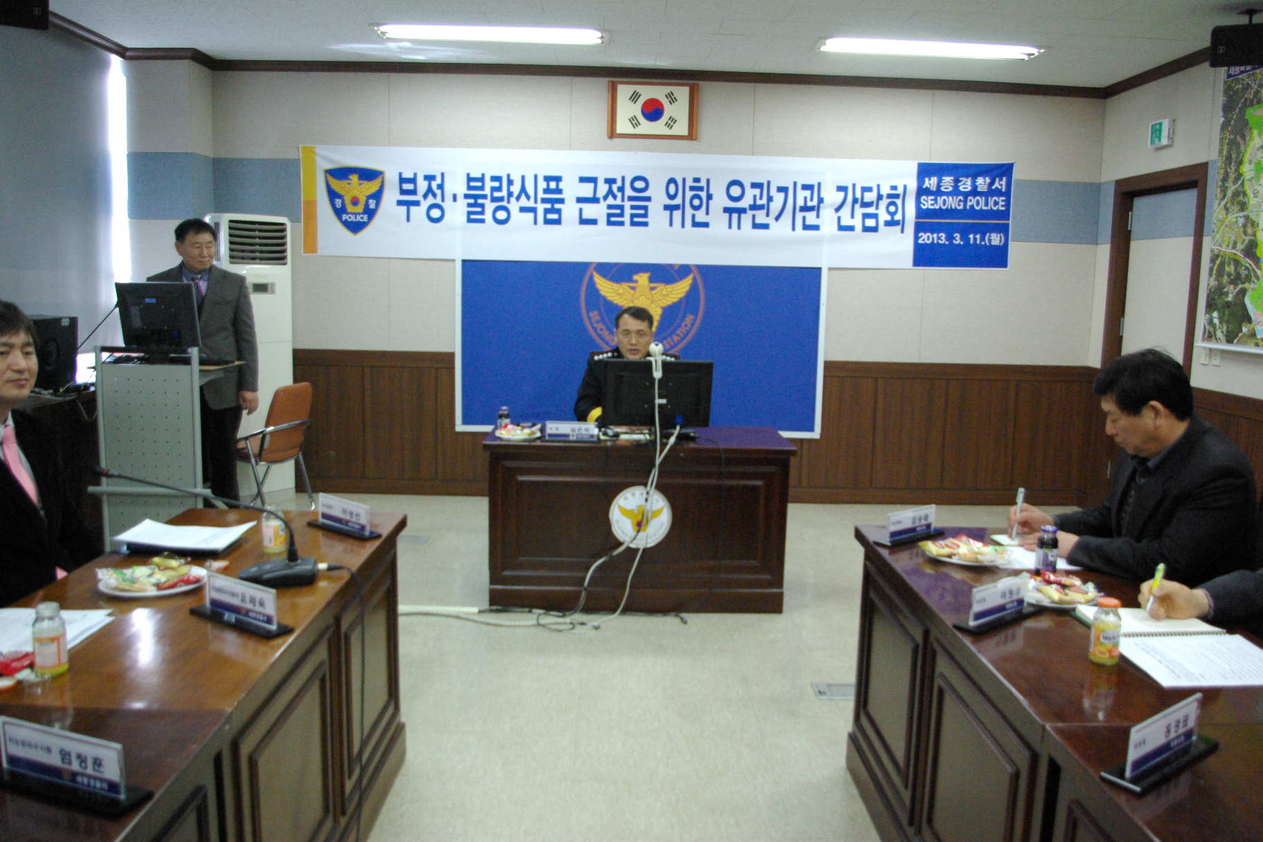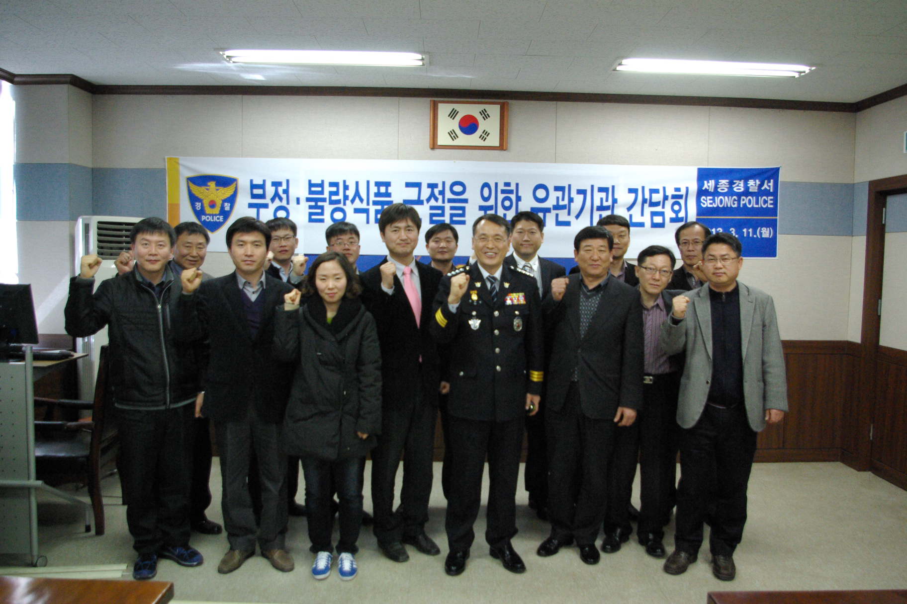 경찰서(서장 심은석)는 11일 소회의실에서 경찰관 10명, 세종시청 위생계장 김승태(특별사법경찰 포함) 6인등 총16명이 참석한 가운데 국민건강을 위협하는 부정·불량식품 근절을 위한 유관기관 간담회를 개최했다.