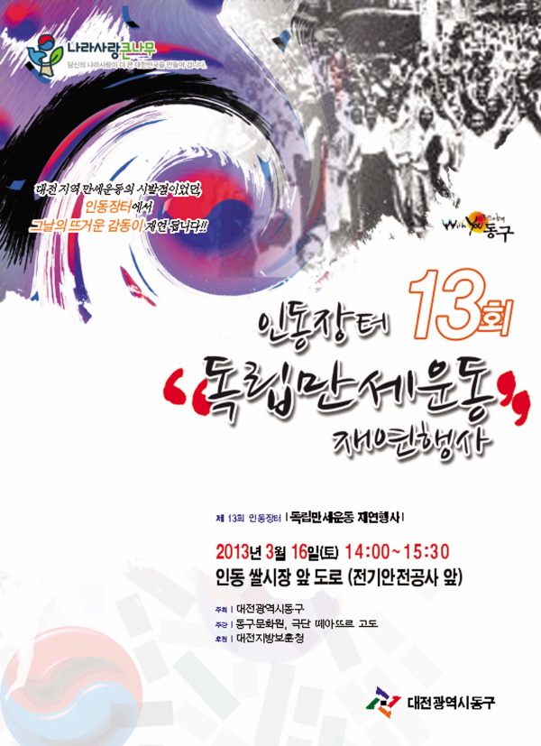 대전 동구(구청장 한현택)는 16일 오후 2시 인동 쌀시장 앞(전기안전공사 앞)에서 제13회 3.16 인동장터 독립만세운동 재연행사를 개최한다.