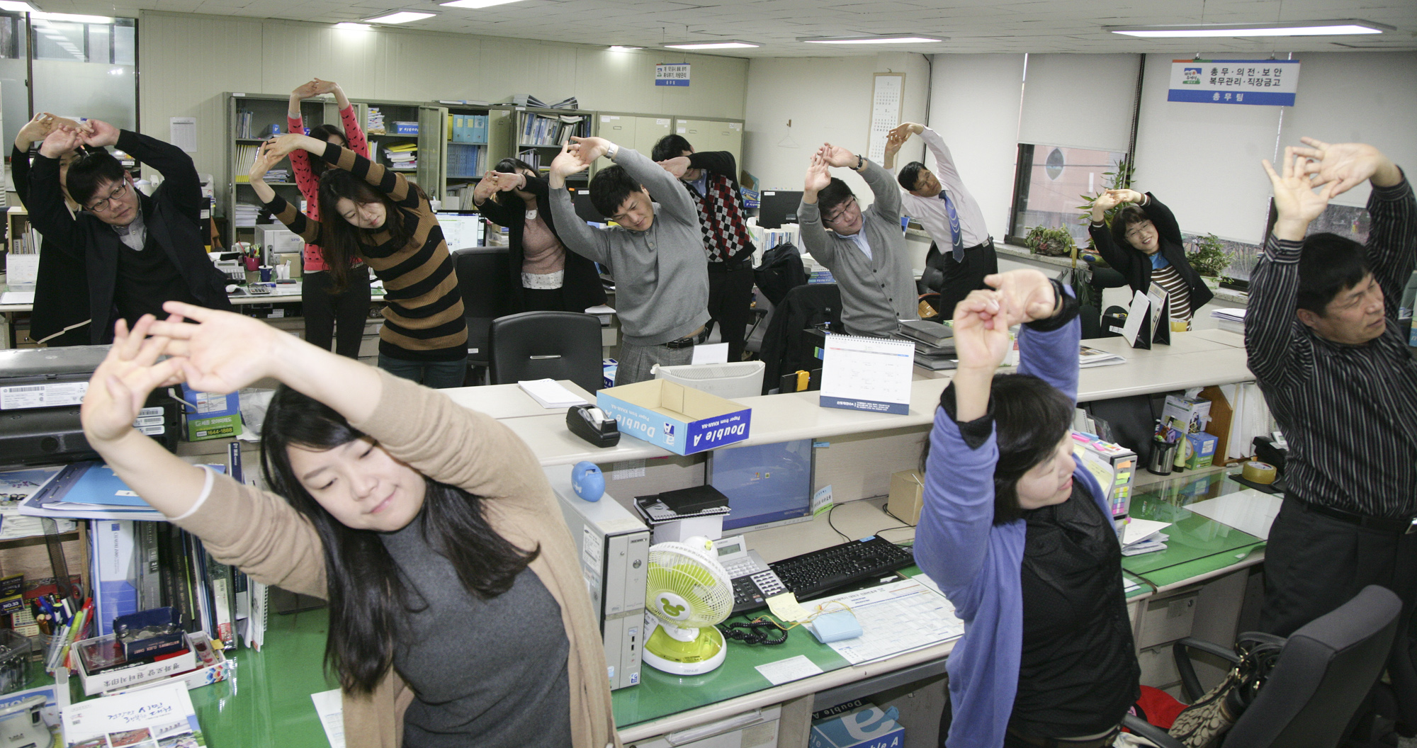 몸과 마음의 긴장을 풀고 업무의 효율성을 높이기 위해 매일 8시50분부터 5분간 실시하는 건강체조는 신나는 댄스음악에 맞춰 스트레칭부터 가벼운 댄스까지 원하는 대로 몸을 움직이면 된다.