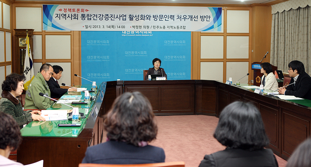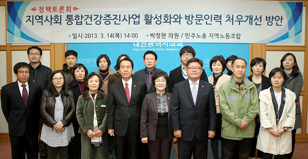 대전시의회 박정현의원(민주통합당, 비례대표)은 14일 오후2시, 대전광역시의회 4층 대회의실에서 ‘지역사회 통합건강증진사업 활성화와 방문인력 처우개선 방안’ 정책토론회를 민주노총 지역노동조합과 공동으로 주최했다.