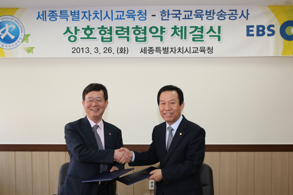 세종특별자치시교육청(교육감 신정균)과 한국교육방송공사(사장 신용섭)는 26일 오전 11시 30분 세종시교육청에서 EBS 교육콘텐츠 활용 활성화를 통한 공교육 강화와 사교육비 경감을 위해 상호협력협약 체결식을 가졌다.