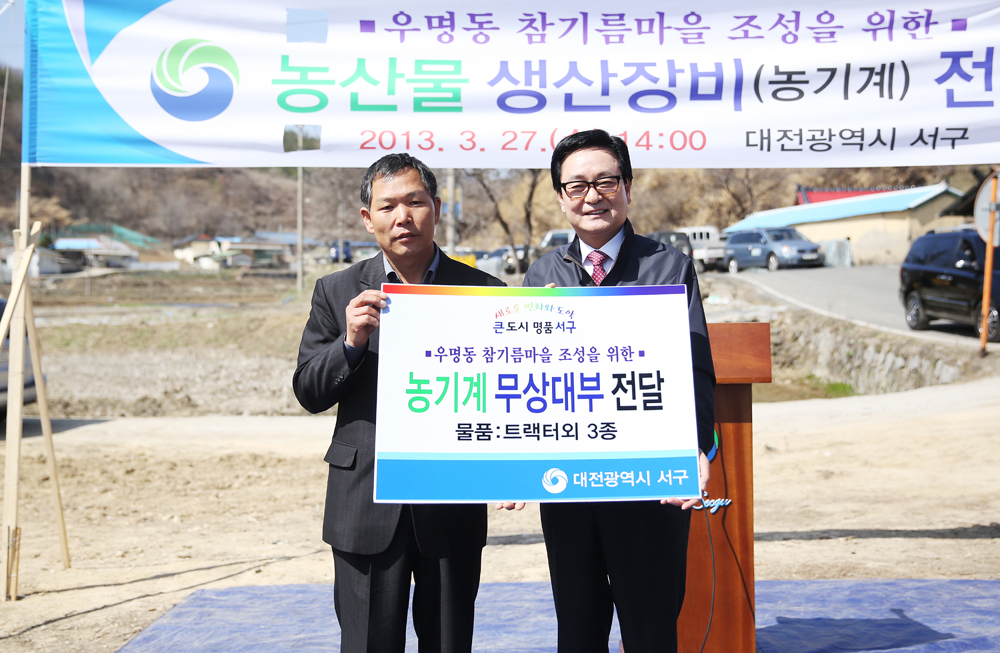 대전 서구(구청장 박환용)는 우명동 참기름마을 조성을 위한 첫 단추로 27일 우명동 참기름마을 조성부지(우명동 251번지)에서 서구청장, 구의회 의장, 구 의원, 지역주민 등 50여명이 참석한 가운데 참깨 재배를 위한 농산물 생산장비(농기계) 전달식을 개최했다.