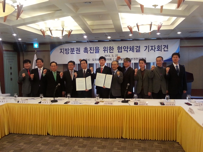 전국시·도의회의장협의회와 균형발전지방분권전국연대는 27일 서울 프레스센터에서 정부에 “지방자치 발전을 위한 지방분권 정책의 10대 핵심과제”를 촉구하고 이를 공동으로 실현하기 위하여 협약을 체결했다.
