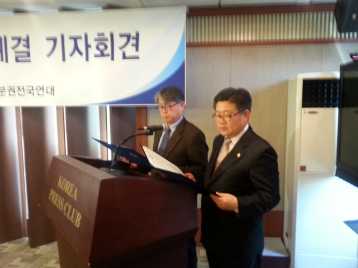 이날 협약식에서 전국시도의회의장협의회 사무총장인 곽영교 대전시의회의장과 균형발전지방분권전국연대 이상선 공동대표가 10대 핵심과제를 낭독하고 협약체결에 대한 공동 기자회견을 가졌다.