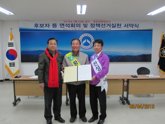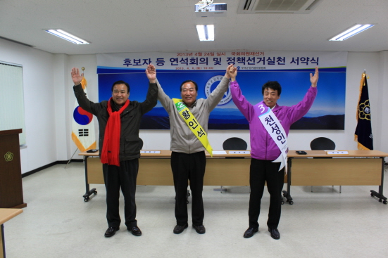 부여군선거관리위원회는 6일 오전 10시부터 1층 회의실에서 이번 국회의원재선거에 출마한 기호1번 새누리당 이완구, 기호2번 민주통합당 황인석, 기호3번 통합진보당 천성인 등 세 후보자와 그 선거사무관계자들이 참석한 가운데 후보자 연석회의를 갖고 이어서 정책선거 실천 서약식을 개최했다.