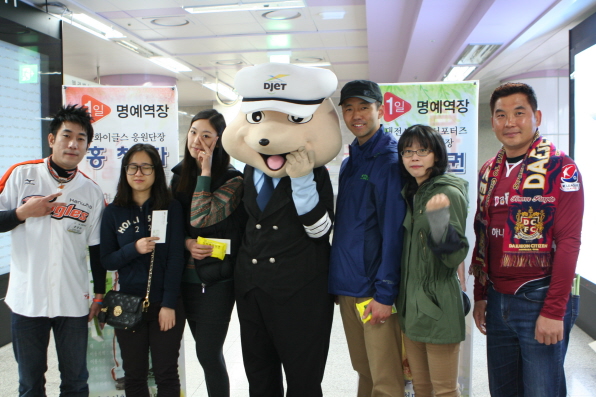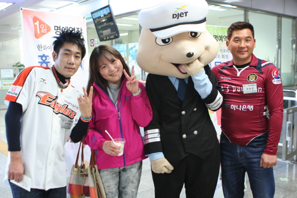대전도시철도공사 명예홍보대사로 활동중인 김무권 회장(대전시티즌 퍼플크루),홍창화 응원단장(한화 이글스)은 8일 오후 중앙로역에서 ‘1일 역장’으로 나서 고객의 행복한 하루를 응원한 것.
