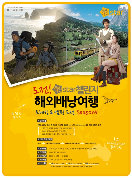 KB국민은행(은행장 민병덕, www.kbstar.com)은 락스타 출범과 함께 지속적으로 실시해온 대학생 해외배낭여행 '락스타 챌린지 5기'를 모집한다.