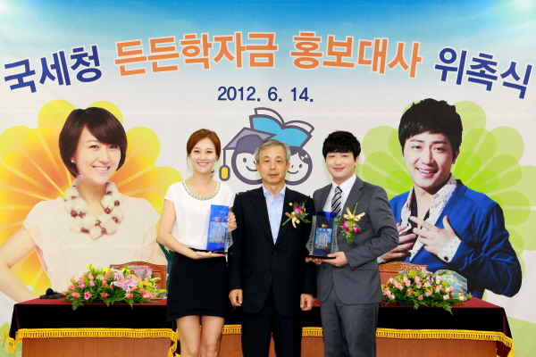 (사진/국세청 제공)국세청은 14일 인기가수 장윤정과 박현빈(박지웅)을 든든학자금 홍보대사로 위촉했다. 이들 두 홍보대사는 앞으로 국세청의 든든학자금(ICL : Income Contingent Loan) 상환을 알리기 위해 홍보포스터・리플릿 사진모델 등 다양한 홍보활동에 참여할 예정이다.