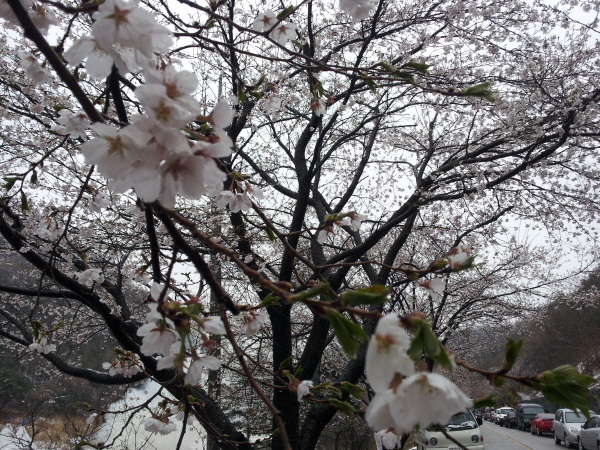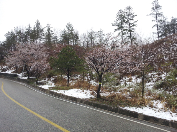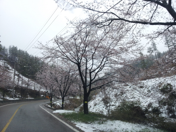 봄비 함박눈으로 바뀌면서 산벚꽃과 어우러져 몽환적인 풍경연출