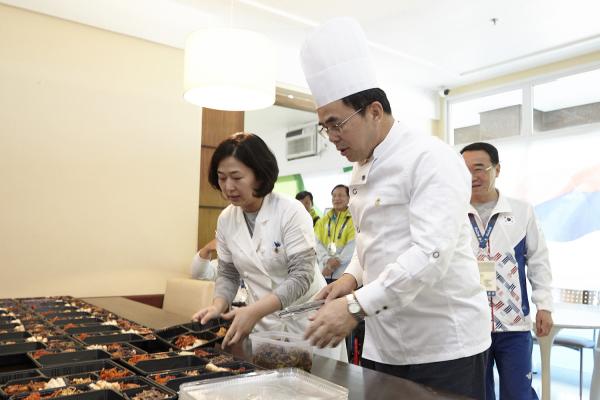 또한, 한식지원팀에게는 “따뜻한 밥을 지어 선수단에게 전하는 것이 선수단에게 심리적인 안정감을 주며 좋은 컨디션을 유지하는데 큰 역할을 한다. 이른 새벽부터 음식을 준비하느라 고생이 많겠지만 보람을 가지고 일해주길 바란다.”고 격려했다.