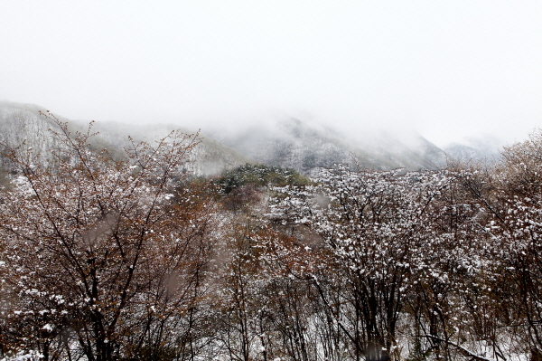 산꽃축제가 열리고 있는 충남 금산군 군북면 보곡산골에 20일 함박눈이 내렸다. 신록, 산벚꽃, 눈꽃이 어우러져