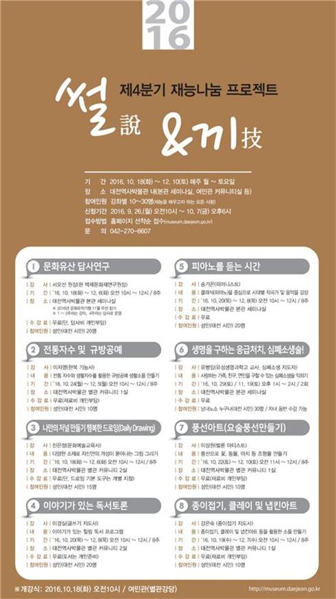 제4분기 재능나눔 프로그램은 대전역사박물관에서 10월 18일부터 12월 10일까지 8주간, 매주 월요일부터 토요일까지 운영된다.
