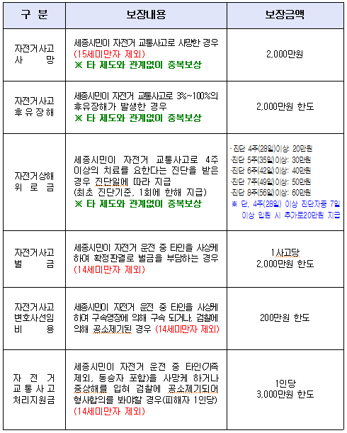 세종시에 주소를 둔 시민(외국인등록자 포함)은 누구나 별도의 보험가입 절차 없이 자동적으로 보험에 가입돼 전국 어디서나 자전거사고 발생 시 보험혜택을 받을 수 있다.