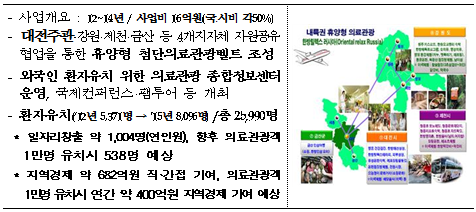 ‘휴양형 의료관광사업’은 2012년 국토교통부 공모에서 선정된 시범사업으로 대전시가 주관하고 강원도, 충북 제천시, 충남 금산군 등 4개 지자체가 참여해 2014년까지 진행했다.