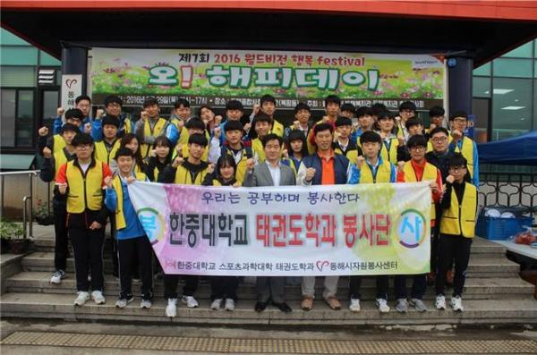 한편, 한중대학교 스포츠과학대학 태권도학과 봉사단은 지난 2012년에 구성돼, 저소득층을 대상으로 태권도 봉사, 연탄배달, 행사 지원 등 지역의 어렵고 힘든 이웃을 스스로 찾아가서 적극적인 봉사활동을 펼치고 있어 지역주민에게 모범이 되고 있다.