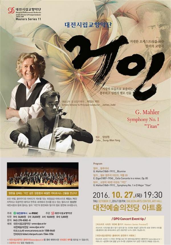 [세종TV-황대혁 기자] 대전시립교향악단은 제8대 예술감독 겸 상임지휘자로 취임한 제임스 저드의 지휘와 지적이고 독창적인 해석 연주로 세계에서 찬사를 받는 첼리스트 양성원이 함께 호흡을 맞추는 마스터즈 시리즈 11 <거인> 연주회를 10월 27일(목) 저녁 7시 30분 대전예술의전당 아트홀에서 개최한다고 밝혔다.