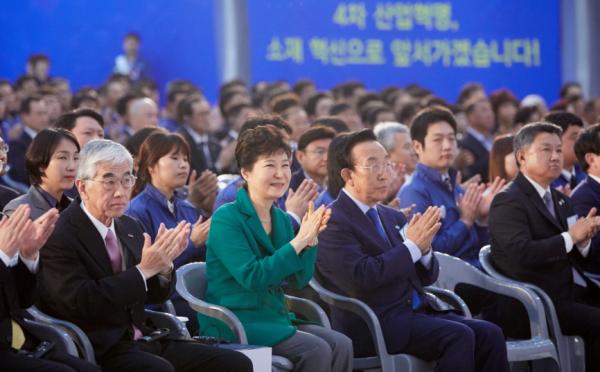 박 대통령은 축사를 통해 `4차 산업혁명을 소재혁신으로 앞서 나가겠다`는 도레이사와 구미 하이테크밸리의 새로운 도전을 힘차게 응원하며 큰 성공을 기원했다.