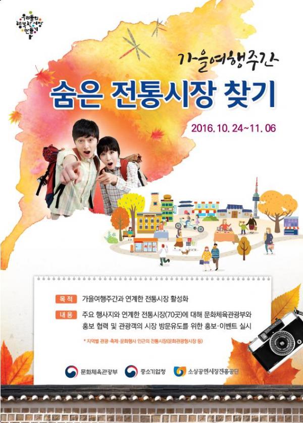 문체부와 중기청은 국민들이 가을여행주간을 즐기면서, 전통시장도 방문할 수 있도록 가을여행주간의 다양한 프로그램과 연계된 ‘전통시장 방문 코스 70선’을 제작했다고 밝혔다.