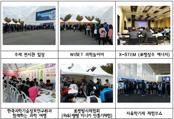 특히, 가상우주현실 체험과 3D프린터 모델링과 프린팅을 직접 체험할 수 있는 프로그램과 드론을 직접 조종해보는 드론조종체험 프로그램은 몰려드는 관람객들로 대성황을 이루었으며 이외에도 정부출연연구기관과 민간연구소기업 체험부스마다 많은 관람객들로 인산인해를 이뤘다.
