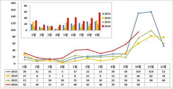 신증후군출혈열은 전년 동기간 대비 94%(’15년 197건 → ’16년 383건), 렙토스피라증은 전년 동기간 대비 96%(’15년 57건 → ’16년 112건) 신고가 증가했다.