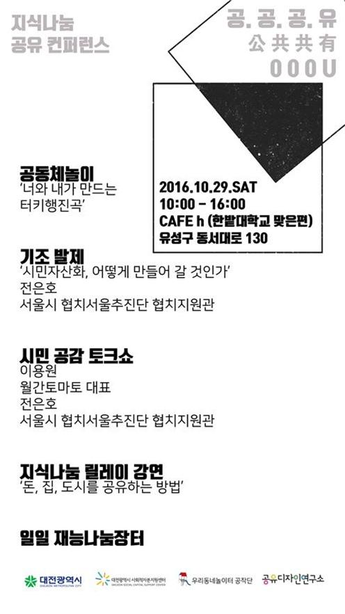 대전광역시는 공유, 공생, 공감의 가치를 대전 시민과 나누는 지식나눔 공유컨퍼런스 ‘공공공유(公共共有 OOOU)’를 오는 29일 오전 10시부터 공유공간 카페에이치 대강당(덕명동)에서 진행한다고 밝혔다.